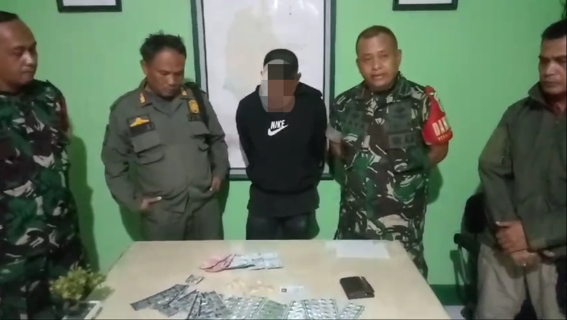 Danramil menjelaskan bahwa dari tangan terduga pelaku diamankan barang bukti berupa obat-obatan keras terlarang berbagai jenis.