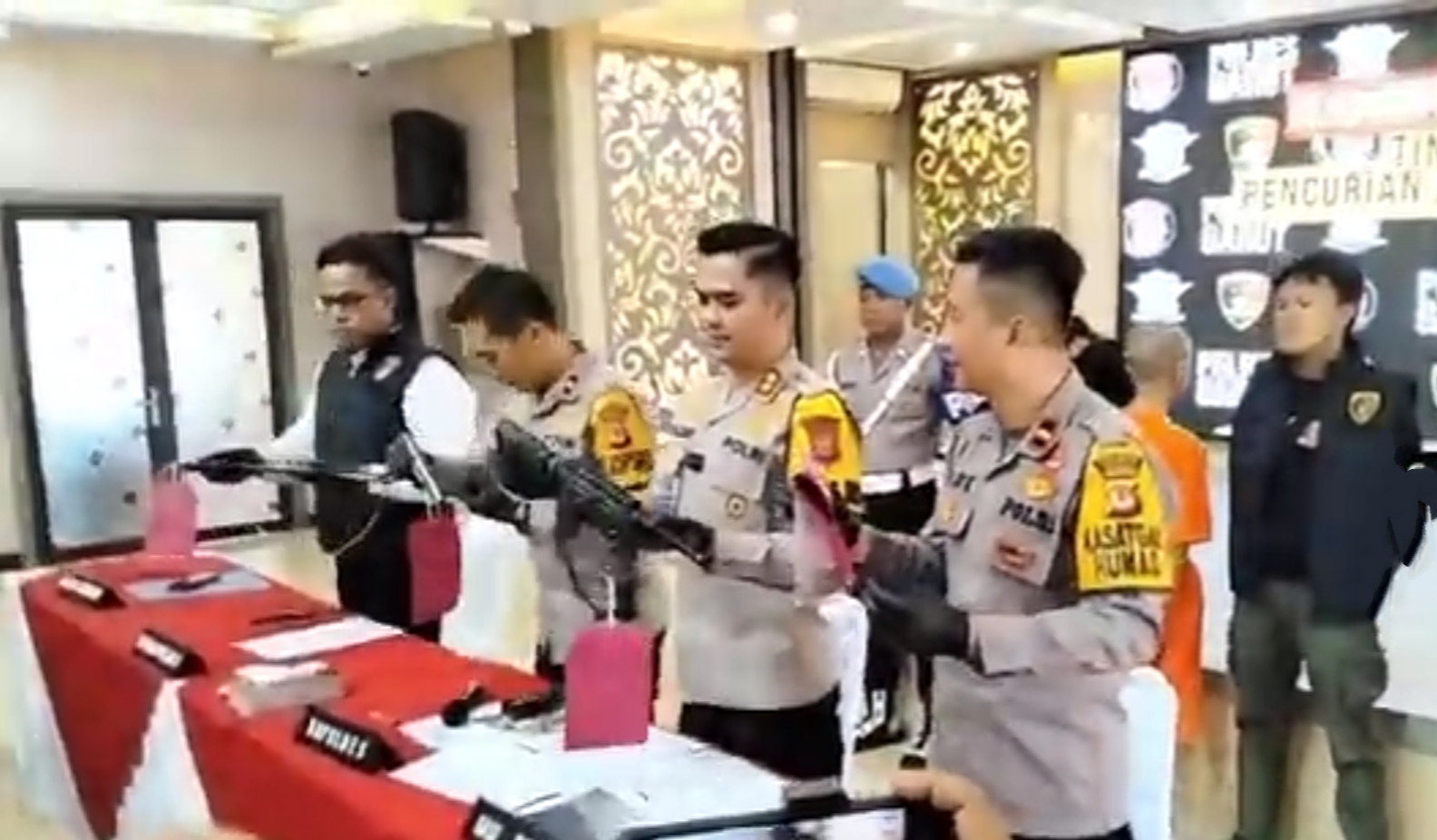 Kapolres menambahkan bahwa dari tangan para pelaku diamankan 1 buah pucuk senjata api Laras panjang, 1 buah pucuk senjata api Laras pendek, 32 butir peluru Laras panjang, 1 buah selongsong peluru dari senjata pelaku, 1 bilah samurai, serta kendaraan motor R2 merk Yamaha Nmax warna merah.