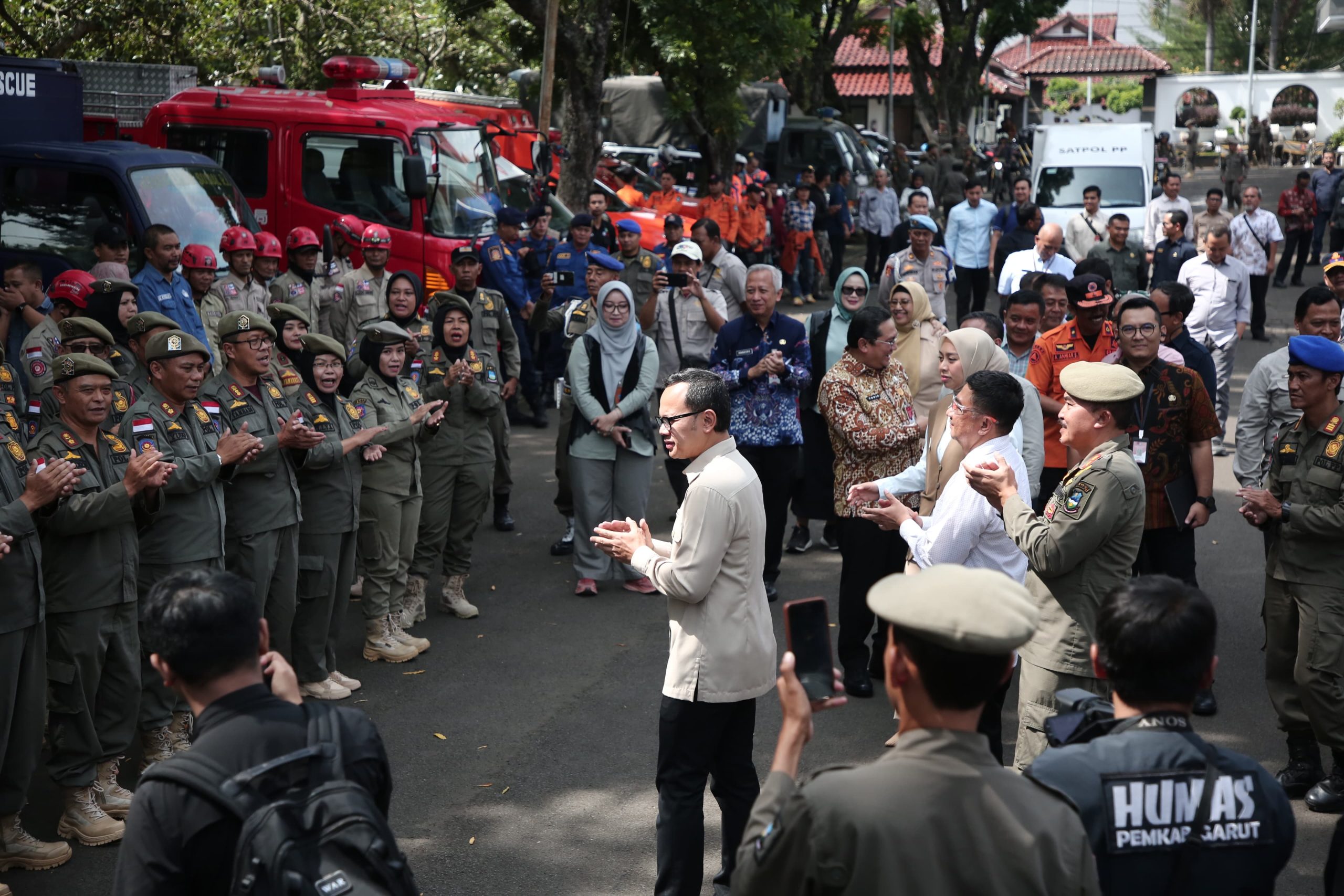 Usai memaparkan program di hadapan bupati, wakil bupati, forkopimda, sekda, para pejabat tinggi pratama, dan para administrator, Wamendagri Bima Arya berkesempatan meninjau gelar kendaraan roda empat/roda dalam rangka mendukung Kelengkapan Pengamanan Idul Fitri Pemerintah Kabupaten Garut Tahun 2025 di Halaman Timur Pendopo Garut, terdiri dari Satpol PP, Dishub, BPBD, Damkar, PUPR, Dinkes, DLH dan Disparbud serta kendaraan roda dua kasi trantrib kecamatan. (Denz/dok:diskominfo)