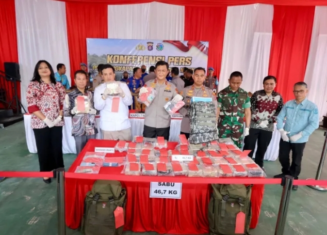 Polisi mengamankan barang bukti berupa 44 bungkus plastik besar berisi sabu dengan total berat 46,7 kilogram. Narkotika itu disimpan dalam tiga tas ransel di mobil Daihatsu Sigra yang digunakan para pelaku. Selain itu, empat tersangka berinisial SF, EW, UM, dan MG juga diamankan.